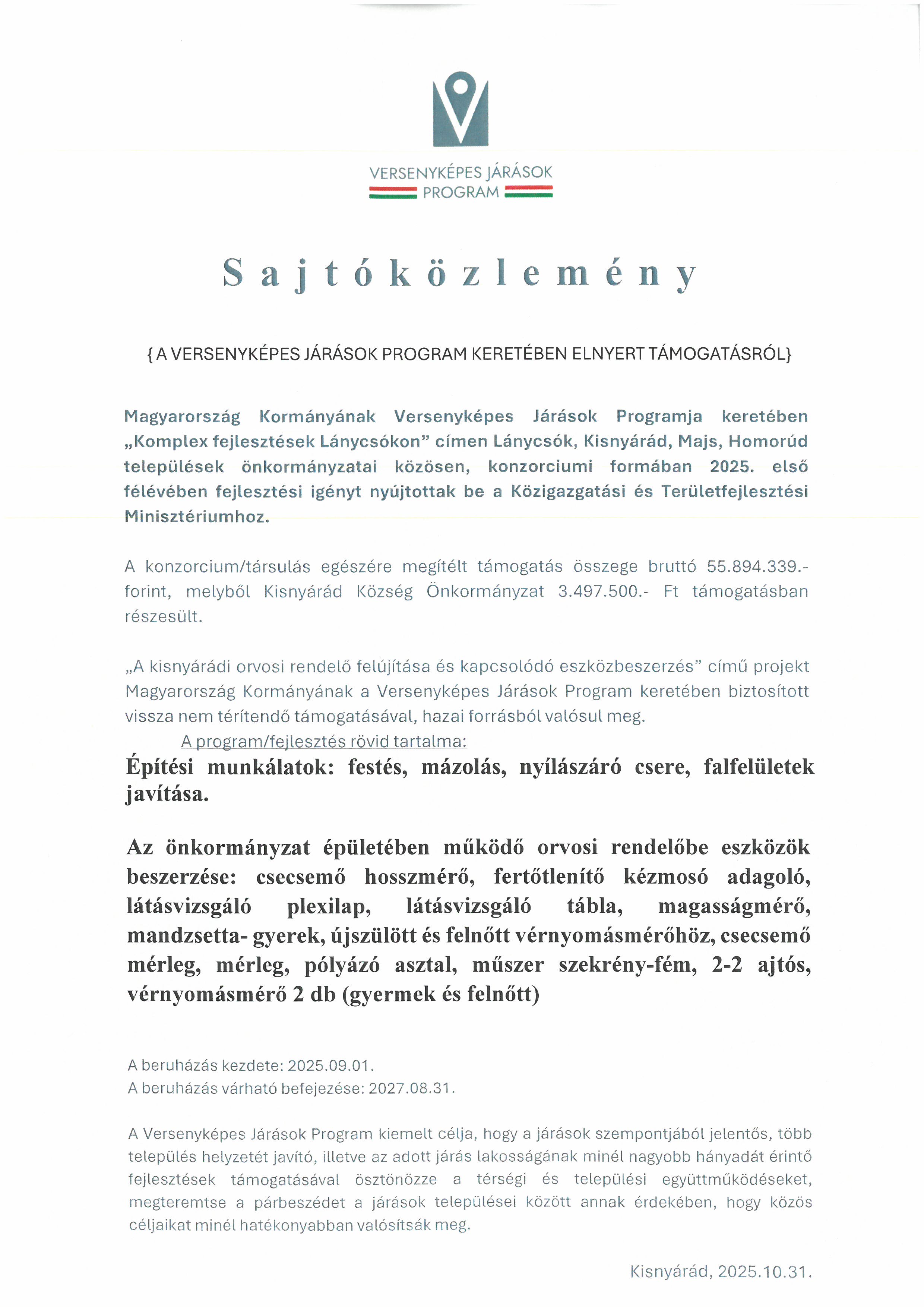 Versenyképes Járások Program -2025. Kisnyárádi orvosi rendelő felújítása és kapcsolódó eszközbeszerzés